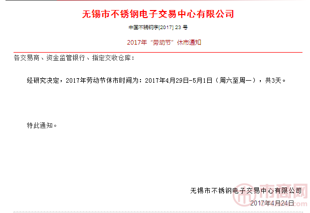 2017年4月24日無錫市不銹鋼電子交易中心官網(wǎng)發(fā)布2017年“勞動節(jié)”休市通知,4月29日至5月1日共3天休市。