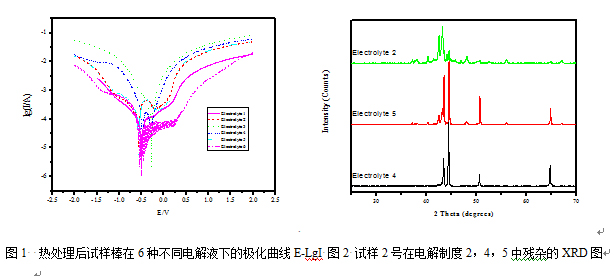不銹鋼中含有較高的Cr、Ni, 溶液中很容易鈍化, 而且鋼中含有的碳化物及金屬間化合物大都比較穩(wěn)定, 所以電解液的酸度應(yīng)該比較大, 活性離子含量也應(yīng)較高, 在水溶液中進(jìn)行電解是比較困難的,如果用醇做溶劑, 對(duì)基體活化溶解的效果更好,同時(shí)可以抑制一些相的水副反應(yīng)的發(fā)生,并使電解后的表面光滑,從而減少損失,便于洗滌。試驗(yàn)首先考查了試樣棒2號(hào)在六種不同電解制度下(電解液不同,但均以醇為溶劑)的極化曲線(圖1)。即利用析出相與基體在電解液中穩(wěn)定電位的差別,外加電流使試樣極化,當(dāng)極化條件合適(即電極電位介于基體的穩(wěn)定電位與析出相穩(wěn)定電位之間),合金基體以一定的速度電解,目的相則以不溶性殘?jiān)男问奖惶崛〕鰜?。圖1顯示腐蝕電流從大到小分別為電解制度4-5-2-6-1-3。因此,電解制度6,1,3的電解速度相對(duì)要慢。電解效果也證明了2205雙相不銹鋼在電解制度2,4,5中的電解效果比較好。而電解制度3和6的均出現(xiàn)明顯的點(diǎn)蝕現(xiàn)象。