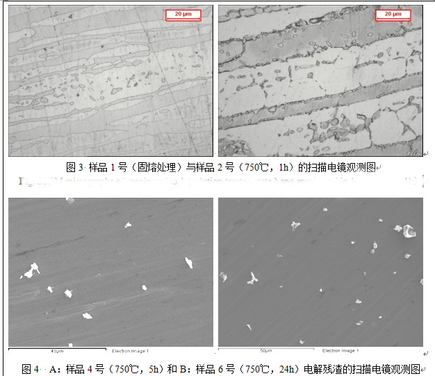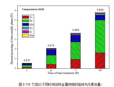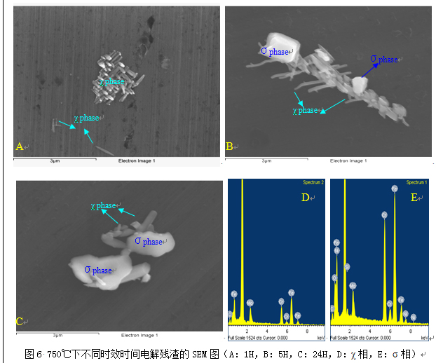 (4)實(shí)驗(yàn)考查了750 ℃回火不同時(shí)間試樣的不同析出相的組成與元素含量,從中可以看到,隨著回火時(shí)間的延長,金屬間相的含量呈明顯上升的趨勢(shì),從1H時(shí)的0.547 %上升到24H的5.802 %。在時(shí)效開始時(shí)先形成金屬間相χ相,而隨著時(shí)間的延長,σ相逐漸形成并最終占主量。