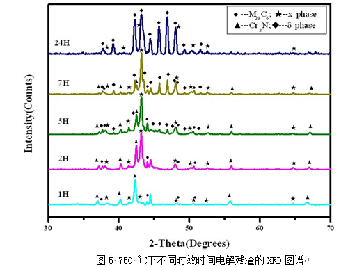 (2)750 ℃時(shí)效1 h后,析出相主要是以M23C6和Cr2N為主, 到2小時(shí),χ相開始形成;5 h以后則有部分σ相出現(xiàn),而后伴隨著時(shí)間的延長,σ相越來越多,相應(yīng)χ相開始減少,到24 h時(shí),σ相已經(jīng)占主導(dǎo)地位,且形成的晶體很完整,XRD圖譜峰和清晰明顯。